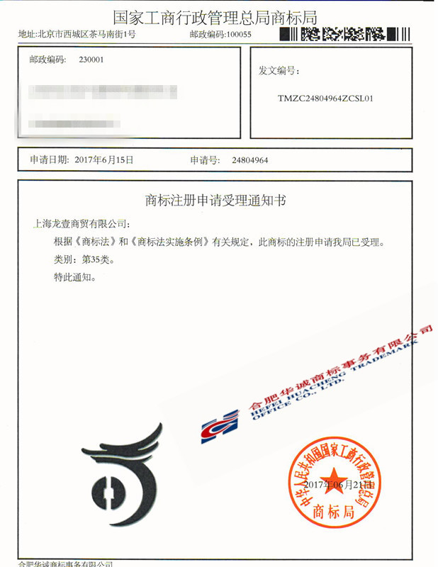 您委托我所代理商标注册申请,名称为“图形”35类商标已被国家商标局受理。