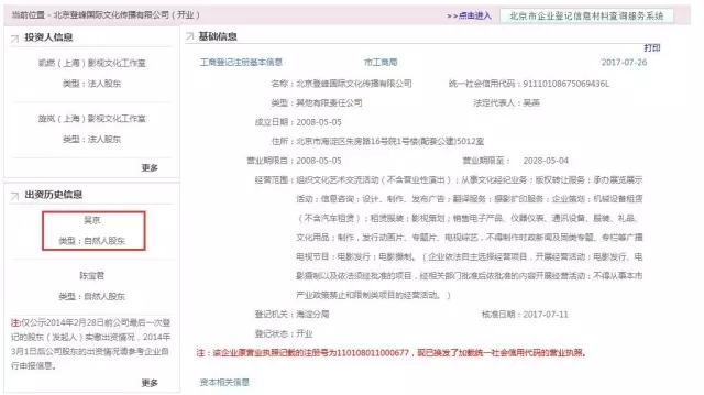 吴京作为大股东的北京登峰国际文化传播有限公司工商信息