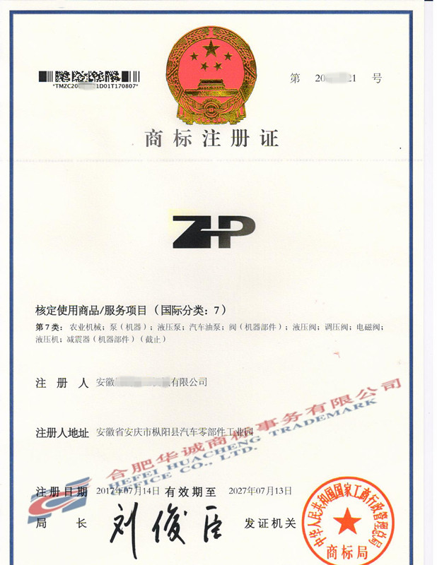 您委托我所代理商标注册申请,名称为“ZP”7类商标注册证已下达。 特此通知。
