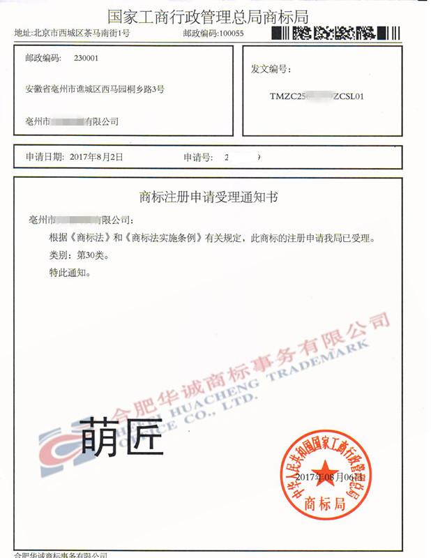 您委托我所代理商标注册申请,名称为“萌匠”30类商标已被国家商标局受理。