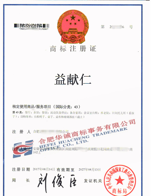 您委托我所代理商标注册申请,名称为“益献仁” 43类商标注册证已下达。