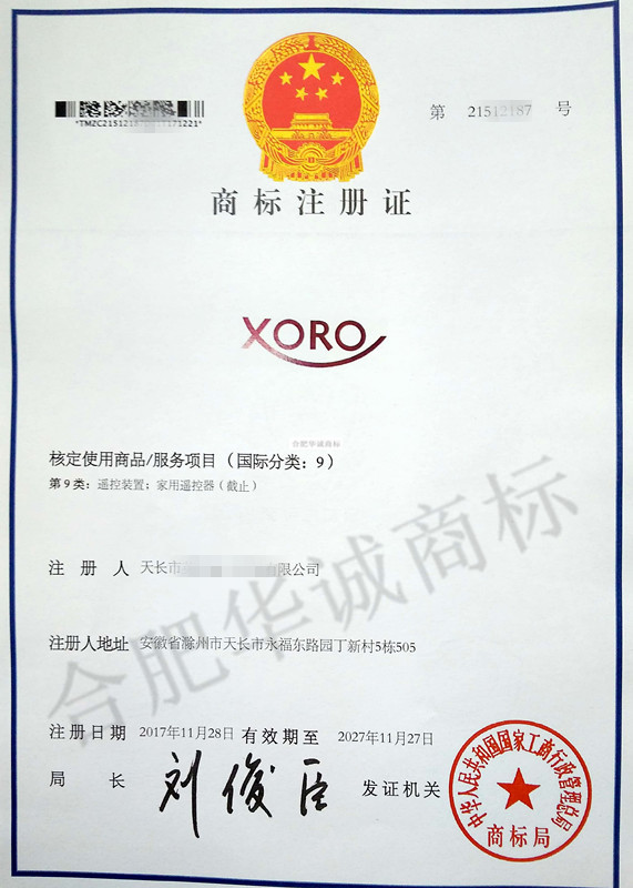 您委托我所代理商标注册申请,名称为“XORO” 9类商标注册证已下达。