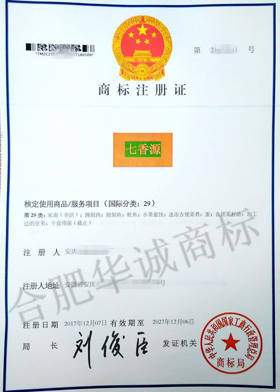 您委托我所代理商标注册申请,名称为“七香源” 29类商标注册证已下达。