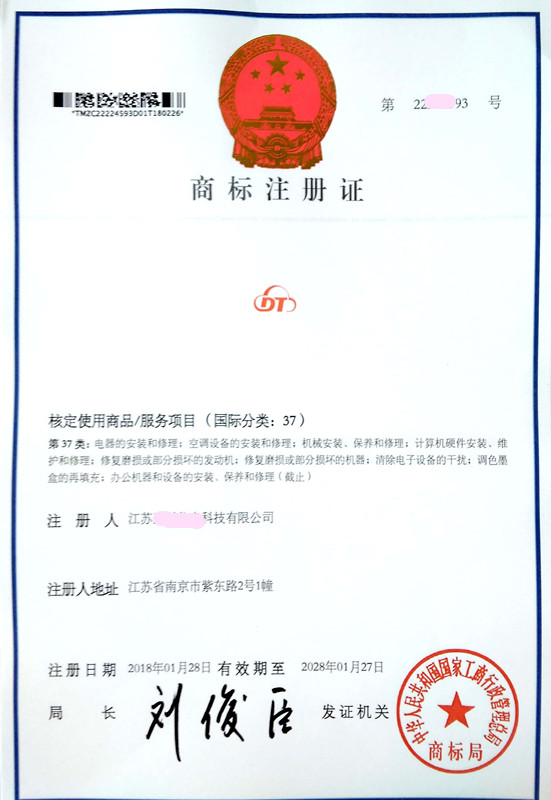 "DT" 37类商标注册证下达