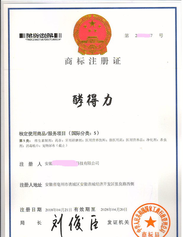 您委托我所代理商标注册申请,名称为“酵得力”5类商标注册证已下达。