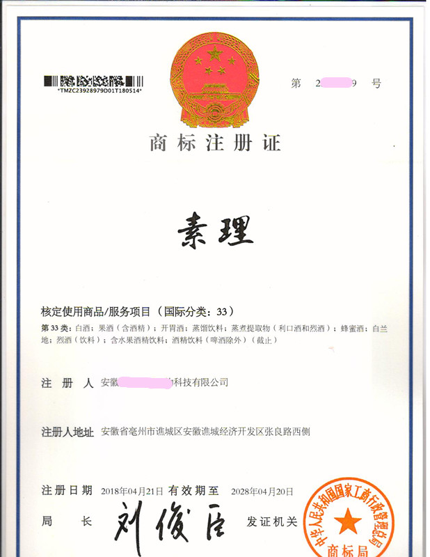 您委托我所代理商标注册申请,名称为“素理”33类商标注册证已下达。