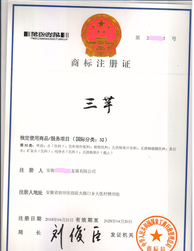 您委托我所代理商标注册申请,名称为“三芋”32类商标注册证已下达。