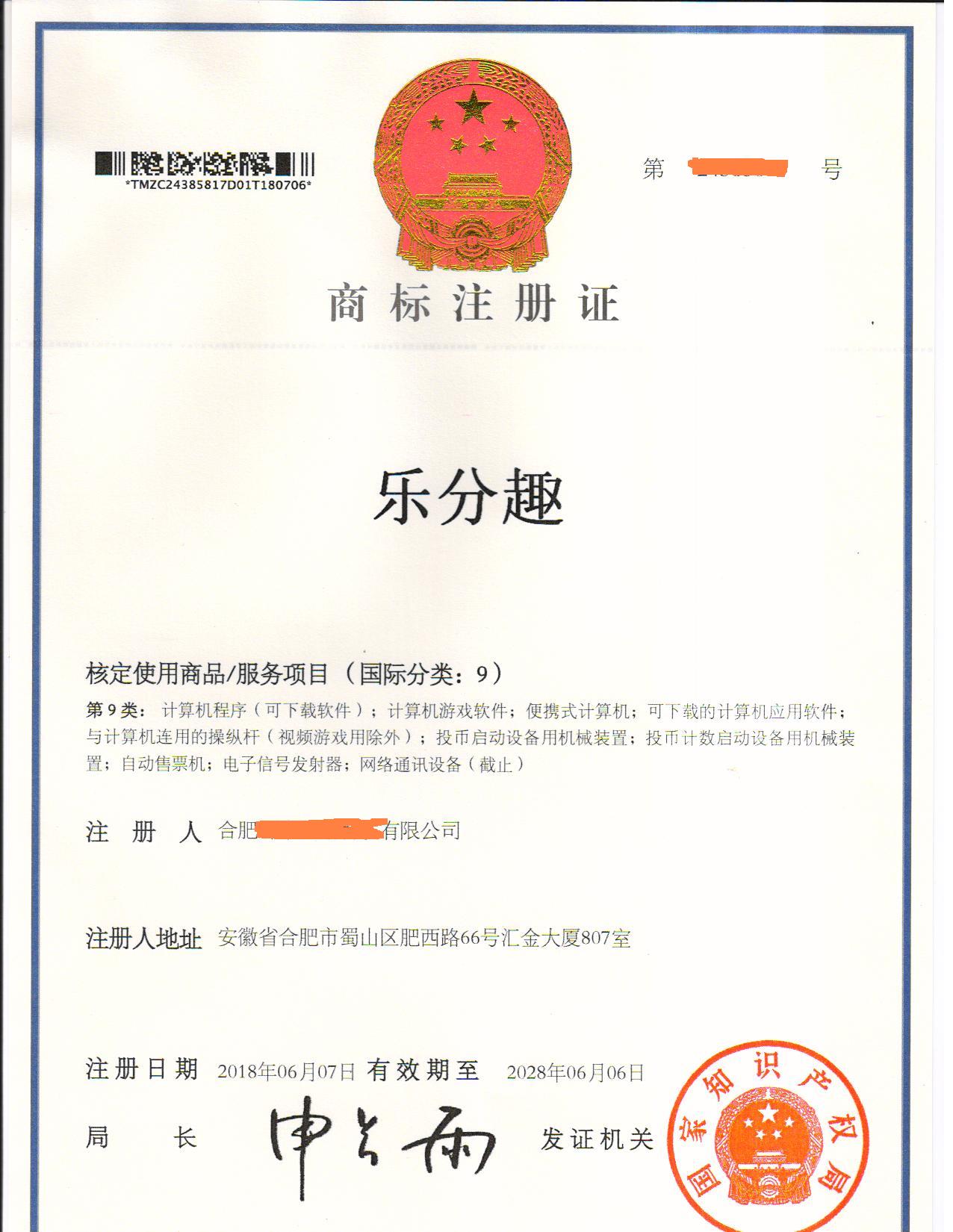 您委托我所代理商标注册申请,名称为“乐分趣”9类商标注册证已下达。