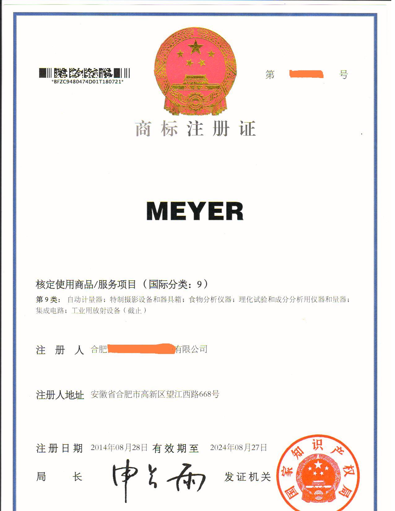 您委托我所代理商标注册申请,名称为“MEYER”9类商标注册证已下达。