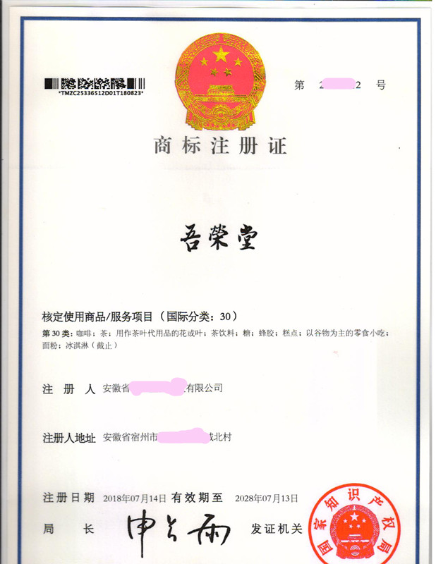 您委托我所代理商标注册申请,名称为“吾荣堂”30类商标注册证已下达。